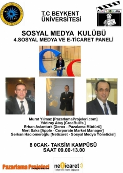 Beykent Üniversitesi Taksim Yerleşkesinde 8 Ocak 2013 09:00-13:00 saatleri arasında gerçekleşecek sosyal medya ve e-ticaret paneli tüm katılımcılara açık ve ücretsiz olarak gerçekleşecektir.Özellikle öğrenciler ve sektörü bir araya getirmeyi ,iş hayatında karşılaşılacak zorluklar,işlemler vb konuları ortaya koyacak panel, sektörün önemli isimlerini buluşturuyor.