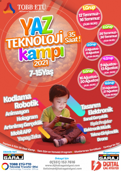 TOBB Ekonomi ve Teknoloji Üniversitesi bünyesinde Dijital Çağ Atölyesi tarafından 7-15 yaş arası öğrencilere düzenlenecek Yaz Teknoloji Kampı 2021 sağlık tedbirleri kapsamında yüz yüze başlıyor. Ön kayıtlar açıldı. Kontenjanlar sınırlı.